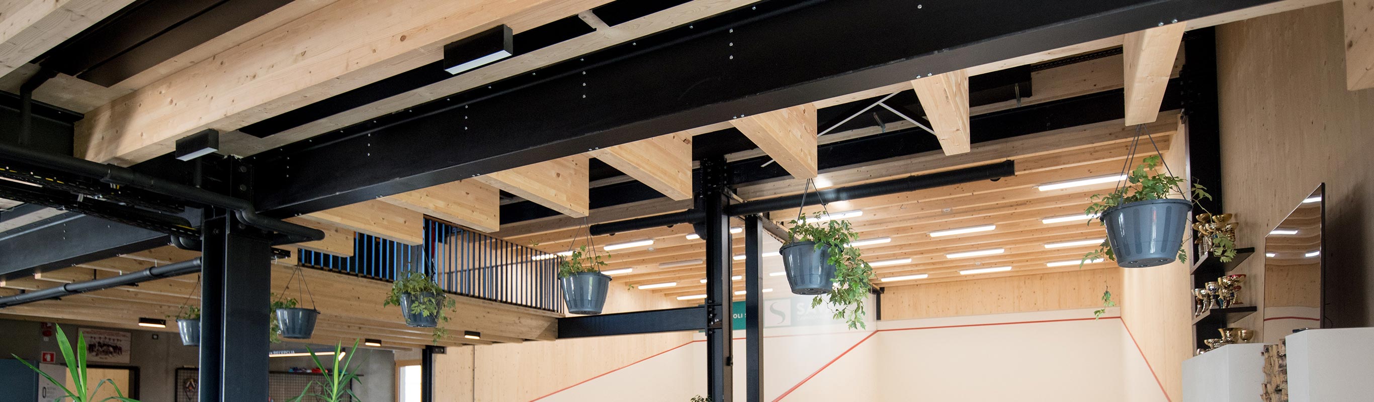 Montaža lesenega nadstreška v Mengšu iz X-Lam lesa. Razpon nadstreška je 15 m in je ob dvigu tehtal kar 25,5 ton.